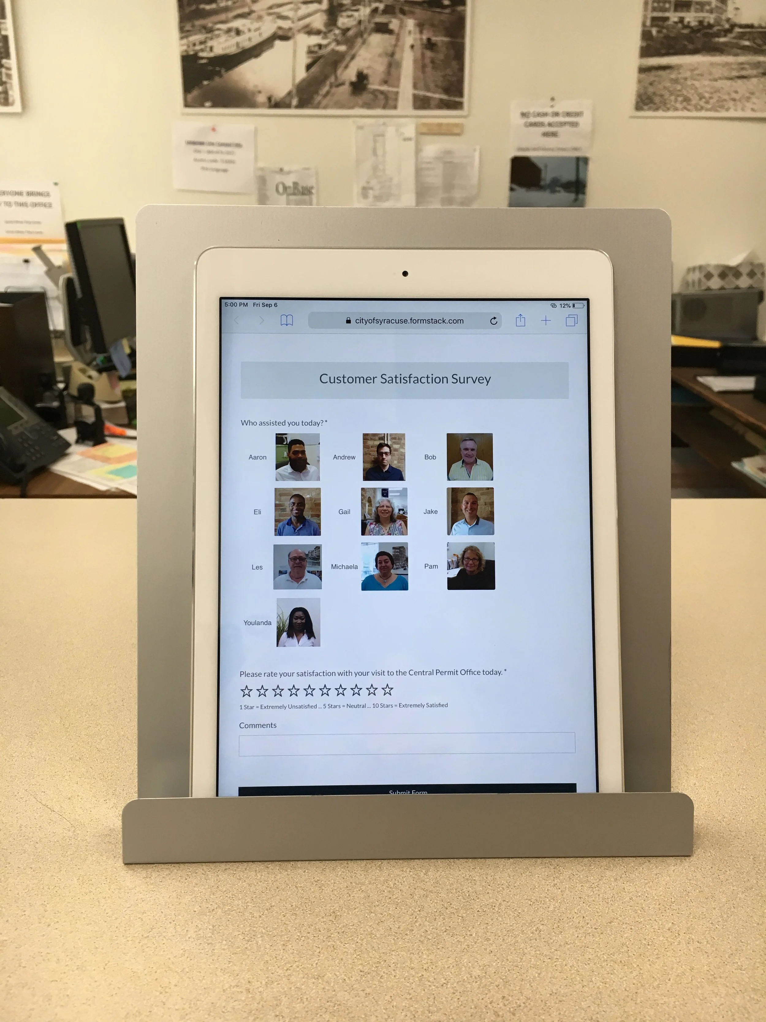 The survey is displayed on a tablet, located near the main door to the Central Permit Office. As customers leave, they will have the opportunity to select the City employee who served them, and rate their experience. We encourage all permit applicants to take the survey, as we expect it to be a valuable tool to help the Central Permit Office continue to improve its service to the community.